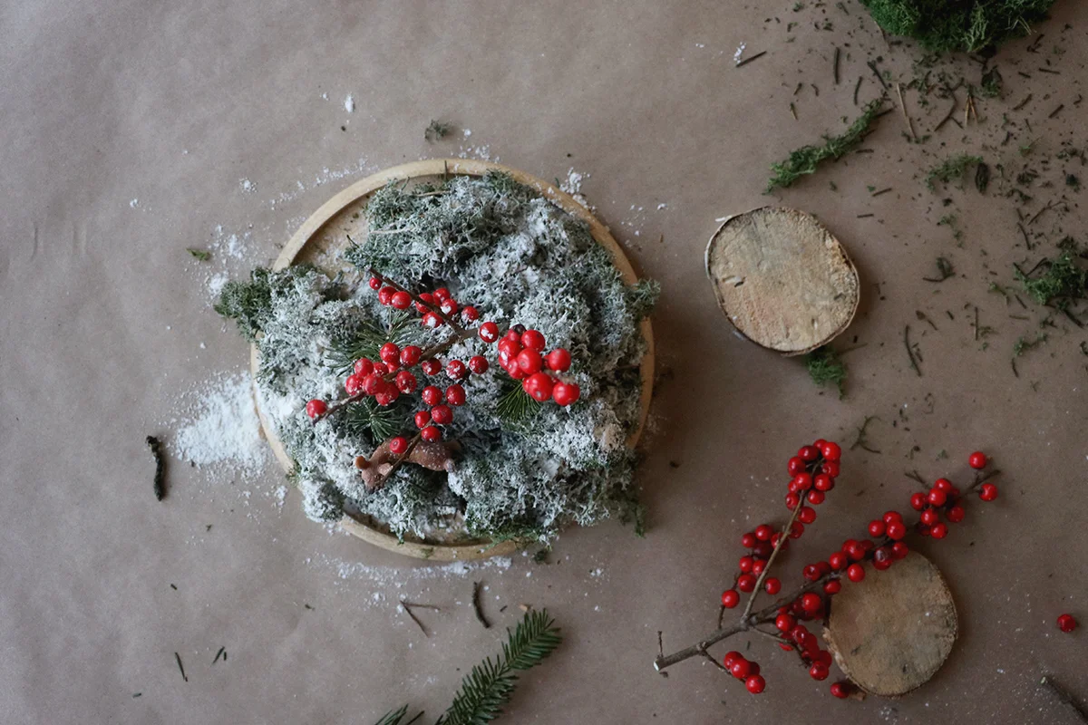 Gather whatever inspires you! Moss, birch wood rounds, sticks, pine branches, winterberries flour for "snow" and little woodland creatures. Most of these things you should be able to find at your local garden or craft stores.