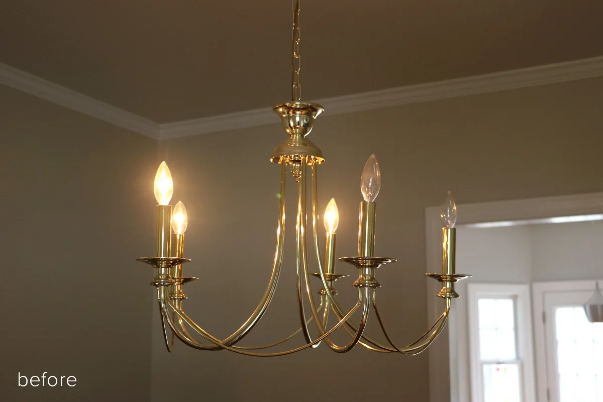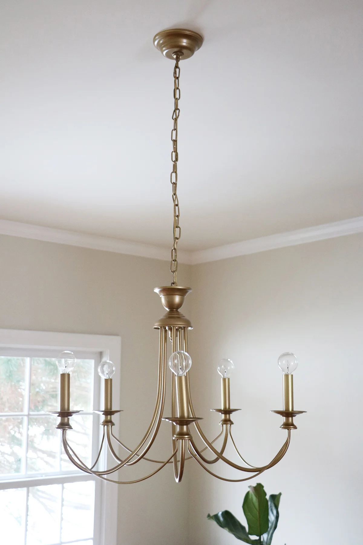 We were so happy the previous owners left us this chandelier, but we wanted a way to give it a bit of a freshening up and make it fit in more with our style. It looks like a different chandelier to me and all we needed was some spray paint and new bulbs!