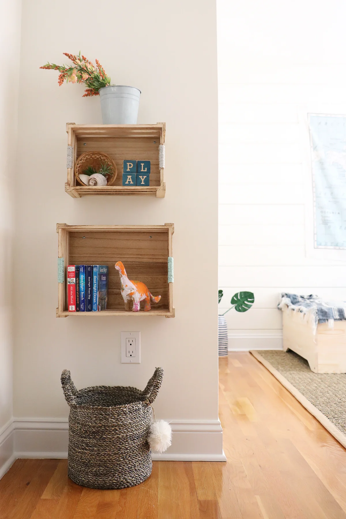 I found these cute crates at Home Goods and knew they would make great shelves! We made sure mostly everything is within reach for Anchor. It's really important to us that his room is made FOR him and it feels that way to him.