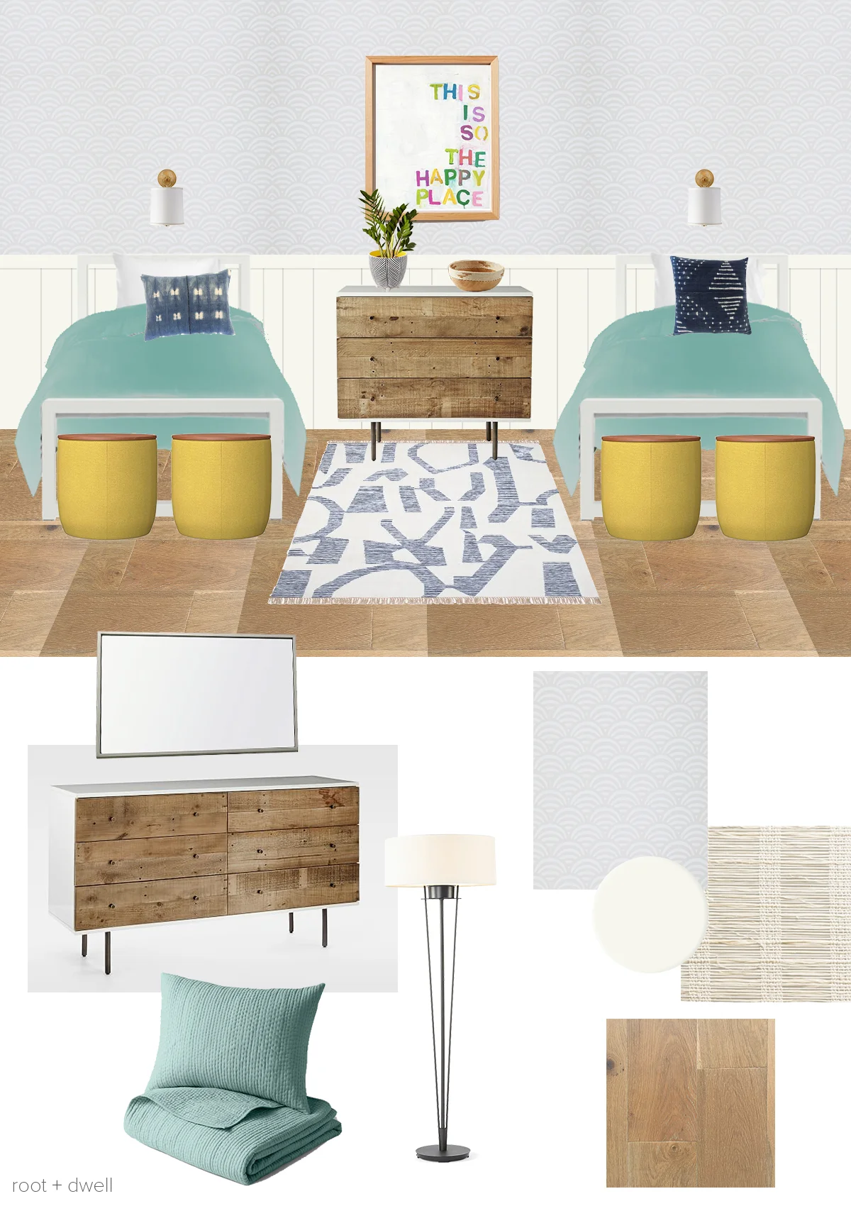 beds | bedding | sconces | wallpaper | flooring | area rug | paint color | woven shades | standing lamp | large dresser | small dresser | mirror | storage ottomans | throw pillow 1 | throw pillow 2 | artwork | plant | planter | bowl