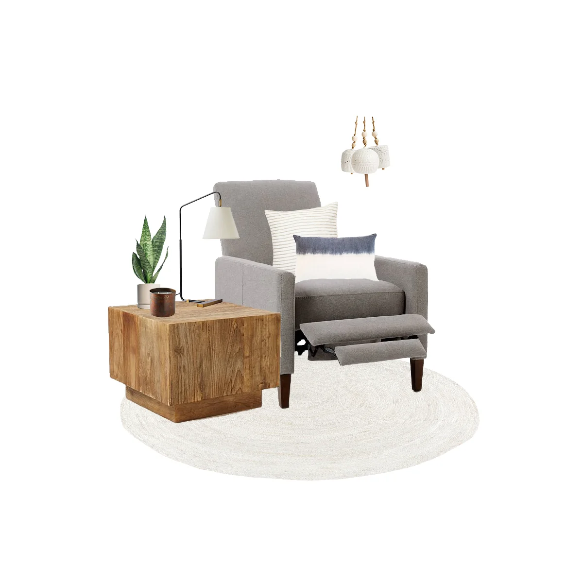 recliner | side table | lamp | rug | bells | candle | plant | stripe pillow | dip dye pillow