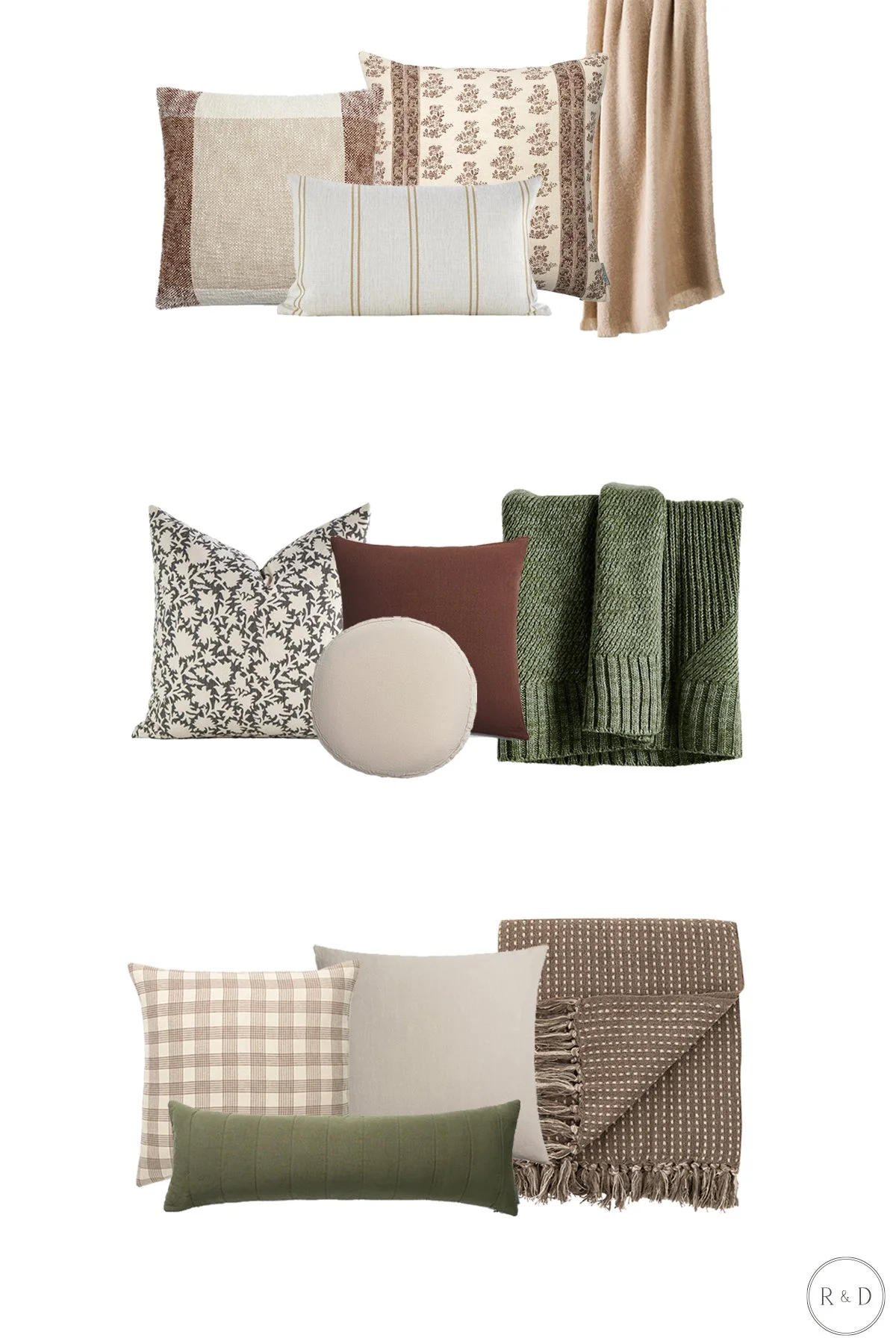 Heavier materials and warm, muted colors. Here are some pillow and throw combo ideas for your inspiration!