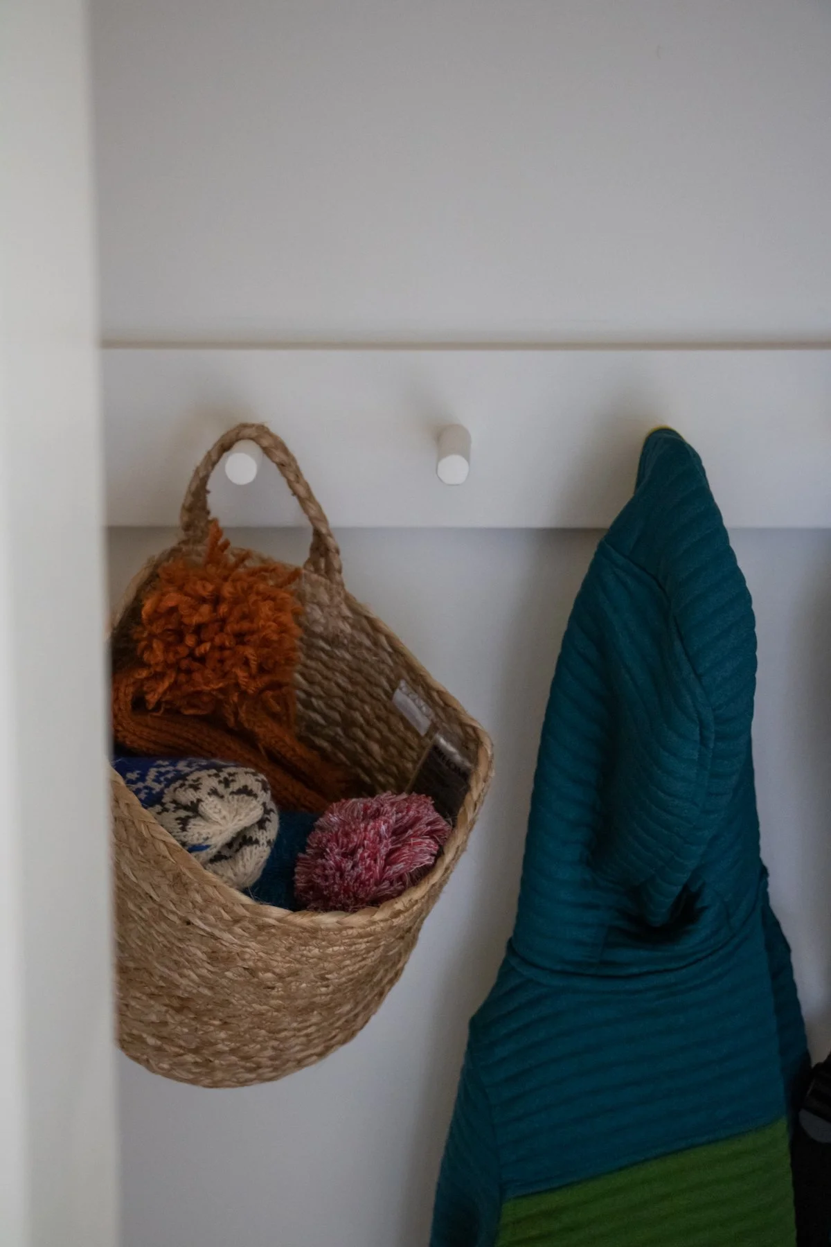 To make the closet more functional for the kids, Dan (and Anchor!) made the custom peg rail for coats, backpacks and I hung a basket for the kids to easily place gloves and hats. A two-tier shoe rack allows the boys to easily place their shoes on their own levels.