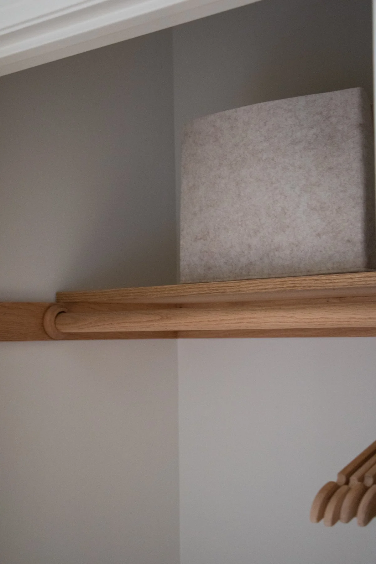 After we finished that part of the closet, the top original wire shelf just didn’t seem to fit in, so Dan suggested we update it. I immediately thought oak would look great against all the white in the closet and tie in with the floors. Dan created a simple oak shelf and rod where I place the less often used items like extra hats, gloves and off-season coats. This is also the closet we use for guests. The oak shelf and rod were also added to our coat closet.